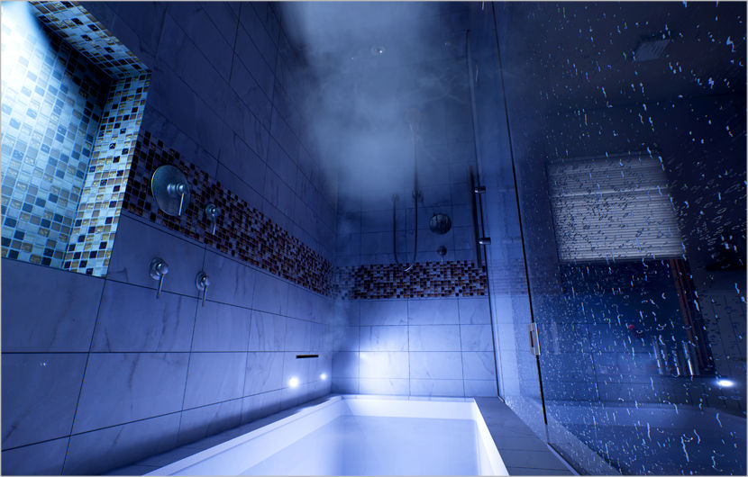 Stress and tension melt away as waves of thick steam emanate throughout the environment from a contemporary linear steam head to blanket the bather. Penetrating waves of soothing heat envelop the senses to create a satisfying moment of relaxation and serenity.